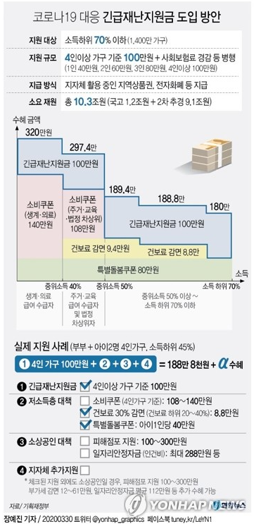 정부가 신종코로나바이러스 감염증(코로나19) 극복을 위해 소득 하위 70% 가구에 긴급재난지원금으로 최대 100만원을 지급하기로 하면서 가구별 지급대상과 시기, 규모에 관해 관심이 커지고 있다. 다음은 정부 자료를 바탕으로 정리한 일문일답입니다.