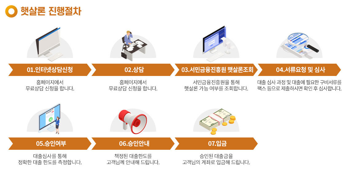 정부에서는 금융 취약계층의 고금리 가계대출 이용에 따른 원리금 상환 부담을 줄이기 위해 서민들이 부담 없이 이용할 수 있는 연 7~8%초반 대의 정부지원 서민대출 햇살론 제도를 시행하고 있다. 아울러 코로나19로 인해 어려움을 겪는 서민들을 위해 공급규모를 1조500억원 확대하며 햇살론대출자격 또한 3개월 이상 재직에서 연중 합산 3개월 이상 재직으로 올해 한시 완화되어 실직 후 재 취업시에도 지원받을 수 있게 되었다. 시중은행 대출을 이용하기 어려운 저 신용자에게 최대 1,500만원까지 저금리로 제공하는 햇살론은 신용 1~8등급에 해당하고 연소득 4,500만원 이하인 직장인, 자영업자, 프리랜서가 신청할 수 있으며 햇살론 대출자격에 해당할 경우 생계자금, 대환대출, 채무통합 등 다양한 용도로 이용할 수 있다. 개개인의 신용등급과 소득에 따라 한도와 금리가 정해지는 햇살론은 취급하고 있는 금융사마다 세부적인 심사와 햇살론대출자격이 다르게 운용되고 있기 때문에 저축은행금리비교 후 진행하는 것이 좋다. 정부, 지자체, 공공기관 및 은행권 등이 다양한 자영업자 지원제도를 운영하고 있으나 도움이 긴요한 영세 자영업자일수록 생업에 바빠 지원제도를 알아볼 시간이 부족하다. 이에 각종 금융지원제도를 종합 안내하여 이용하시는 데 도움을 드리고자 한다. 자영업자 주요 금융지원제도로 창업을 준비하시는 예비사장님 및 운영 노하우가 필요하신 사장님들은 은행권 경영컨설팅 서비스가 있다. 주요 지원내용은 각 분야별 전문가가 △창업절차 △상권분석 △자금조달 △사업장 운영노하우 △마케팅·홍보 △세무·회계·노무 등의 컨설팅을 제공한다. 하나은행, 우리은행, 국민은행, 신한은행, 중소기업은행, IBK기업은행, KB은행, KEB하나은행, 농협은행, NH농협은행, 한국스탠다드차타드은행, 미즈호은행, 대구은행, 수협은행, 부산은행, 한국시티은행, 경남은행, 오케이저축은행, 카카오뱅크, 전북은행, 광주은행, 웰컴저축은행, 에스비아이저축은행, sbi저축은행, BNK저축은행, 페퍼저축은행, 한국투자저축은행, 유진저축은행, 고려저축은행, 제주은행, 신한저축은행, 케이뱅크, K뱅크, 키움저축은행, 새마을금고, 카카오뱅크 은행 영업점 방문 또는 전화로 컨설팅 신청 및 문의 가능하다. 또한 연계 컨설팅으로 일부 은행은 소상공인시장진흥공단, 지역별 신용보증재단 등 유관기관 연계 컨설팅을 제공하고 있으며, 거래은행 영업점에 문의 가능하다. 은행권 외 경영컨설팅 서비스로 서민금융진흥원이 있다. 서민금융 지원대상(미소금융, 햇살론, 햇살론17, 신용회복위원회 채무조정자 등)인 자영업자에게 전문 컨설턴트의 경영진단과 사업 솔루션을 제공하고 있으며, 서민금융콜센터에 문의 가능하다.