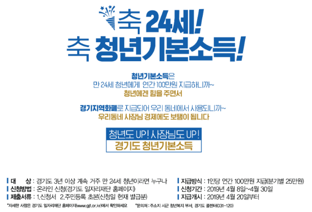청년기본소득은 경기도에 3년 이상 연속으로 거주하거나거주한 일수의 합이 10년 이상인 만 24세의 도내 청년에게 분기별 신청을 받아 그다음 달 20일에 지역화폐로 지급해왔다.