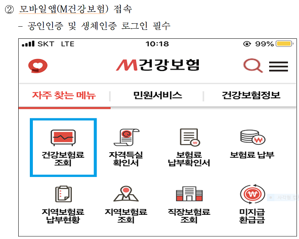 모바일앱을 통해 건강보험료를 확인하기 위해서는 국민건강보험공단 모바일앱인 M건강보험을 다운받아야 합니다. 공인인증 및 생체인증을 통해 로그인한 후 '건강보험료 조회' 메뉴를 선택하면 됩니다.