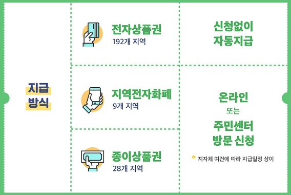 각 지방자치단체별 여건에 맞게 전자상품권, 지역 전자화폐(모바일 또는 카드방식), 종이상품권(지역사랑 상품권) 형태로 지급되고 유흥업소나 대형마트, 백화점, 온라인쇼핑몰 등에서는 사용할 수 없다.