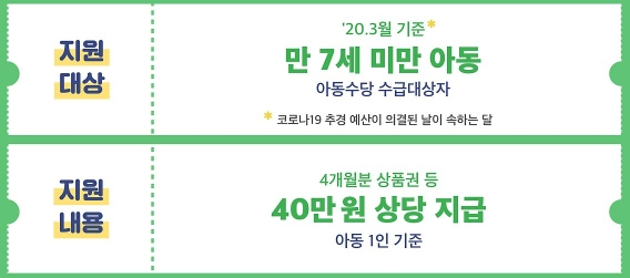 '아동돌봄쿠폰'은 아동수당 대상 가정과 저소득층 소비쿠폰은 만 7세 미만 아동을 대상으로 하며 아동 1인당 40만 원 상당 소비쿠폰이 지급된다.