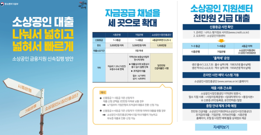 신용등급 4등급 이하의 소상공인은 전국 62개 소상공인시장진흥공단 센터에서 보증서 없이 1,000만 원을 즉시 대출할 수 있습니다.